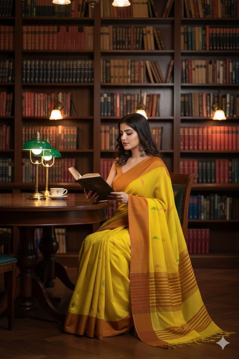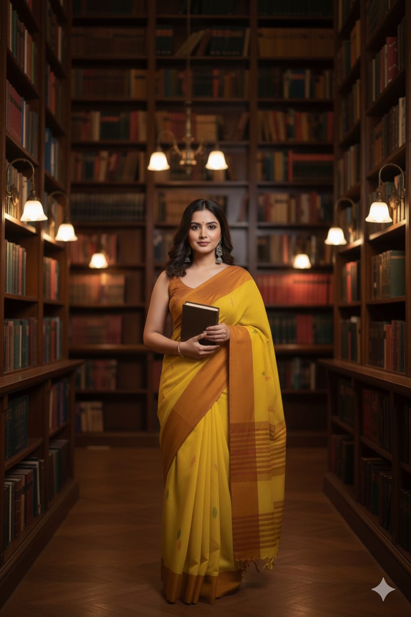 Yellow Khadi Cotton Saree in modest outdoor fit